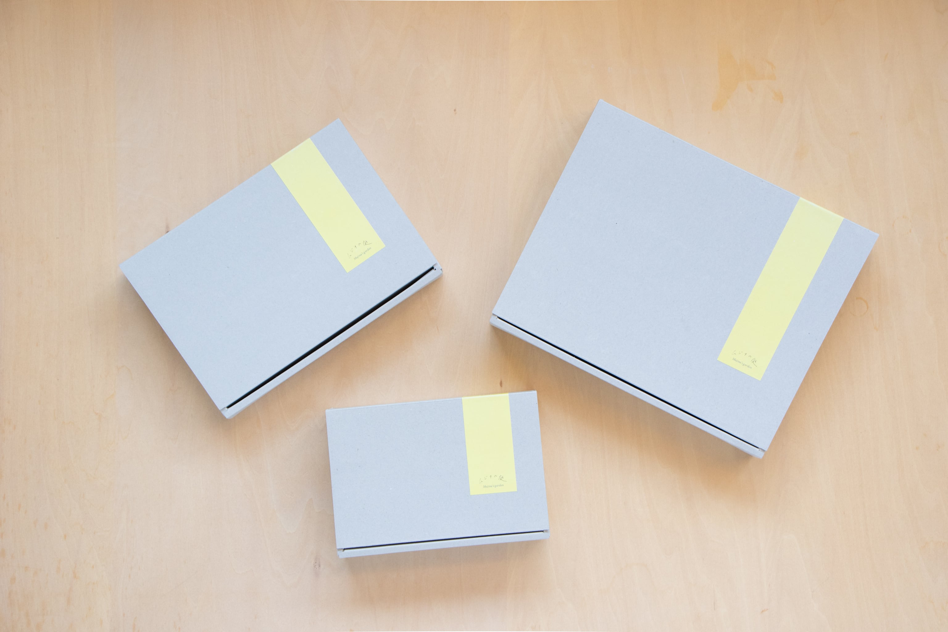 グレーのボックスに、ムジナの庭のテーマカラーのイエローのラベルをあしらった、シンプルなギフトボックスです。